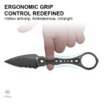 The handle features an ergonomically symmetric design with a hollow construction that reduces weight and optimizes balance for both left- and right-handed grips. All-around anti-slip jimping ensures a secure hold—whether barehanded or gloved—across wet, dark, or challenging environments. At just 2.15 oz (≈ 61 g), the knife offers fatigue-free handling and stress-free all-day carry.